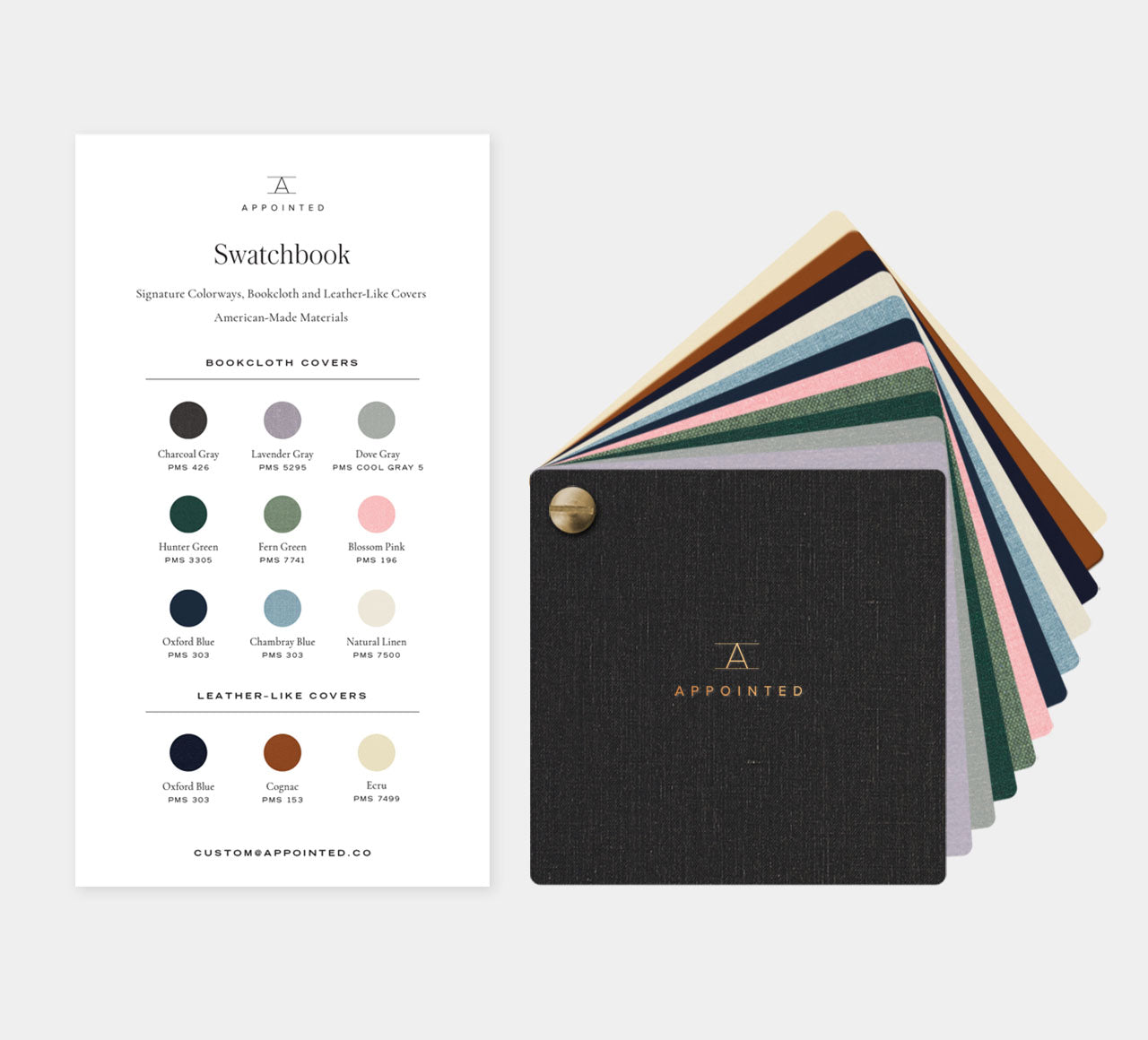 Our Swatchbook contains the entire collection of signature Appointed covers so you can compare and contrast to find the perfect fit for your brand.