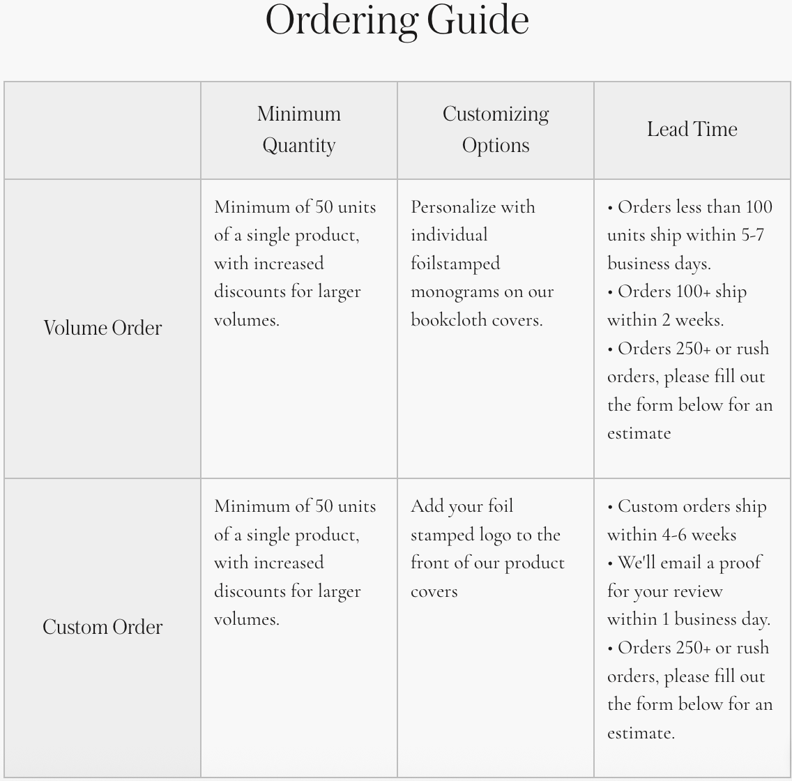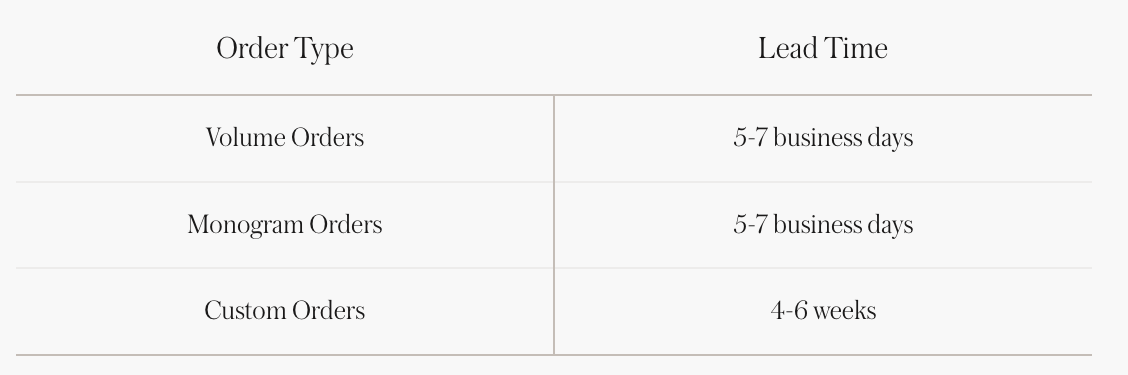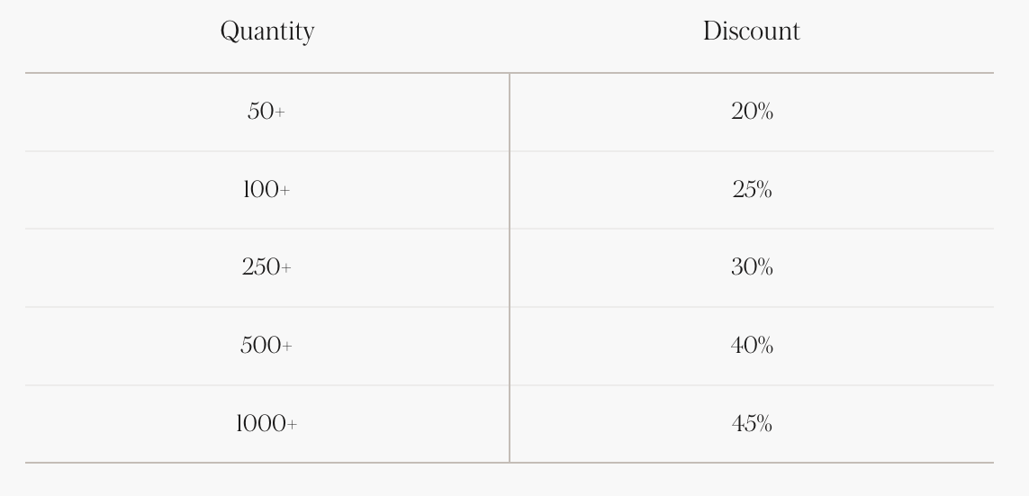 A volume order consists of 50+ of the same item, with increased discounts the more you buy. If you don’t see the product you’re interested in ordering, please reach out to our team at custom@appointed.co.